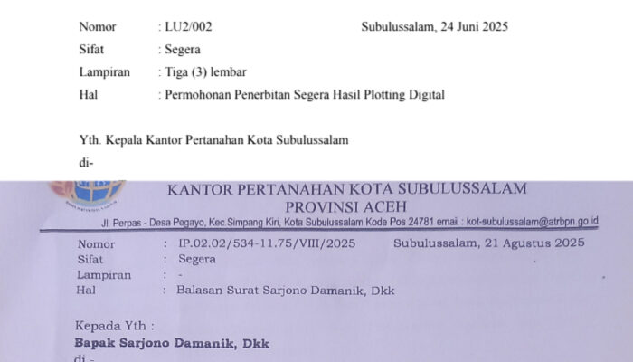 Pasalnya, Surat Sarjono Cs meminta hasil plotting pada 24 Juni 2025 di Desa Lae Simolap, Kecamatan Sultan Daulat ini, dibalas oleh Badan Pertanahan Nasional (BPN) Kota Subulussalam di 21 Agustus 2025, dalam hal Balasan Surat Sarjono Damanik DKK, malah menjelaskan status lahan.