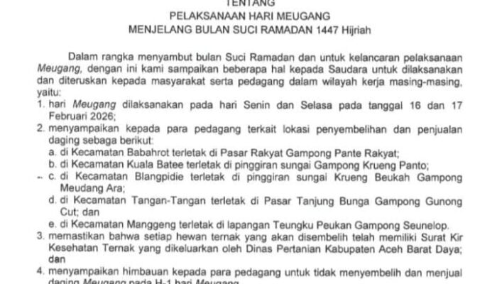 LINEAR.CO.ID | ACEH BARAT DAYA – Bupati Aceh Barat Daya (Abdya), Dr. Safaruddin telah mengeluarkan surat edaran pelaksanaan hari meugang puasa Ramadan 1447 H tahun ini, dengan menetapkan jadwal meugang dua hari yakni Senin dan Selasa 16-17 Februari 2026 mendatang.