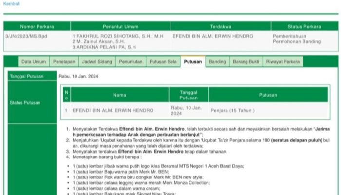 Berdasarkan penelusuran Linear.co.id, Rabu (24/1/2024) di SIPP Pengadilan Mahkamah Syar’iyah (MS) Blangpidie, kabupaten Abdya, terdakwa divonis 15 tahun penjara karena telah terbukti secara sah dan menyakinkan bersalah melakukan Jarimah pemerkosaan terhadap anak dengan perbuatan berlanjut.