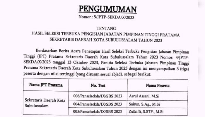 Hal tersebut, Berdasarkan berita acara penetapan hasil seleksi terbuka pengisian Jabatan Pimpinan Tinggi (JPT) Pratama Sekretaris Daerah Kota Subulussalam Tahun 2023 Nomor: 4/JPTP-SEKDA/X/2023 tanggal 13 Oktober 2023. Di laman/website http://bkpsdm.subulussalamkota.go.id/