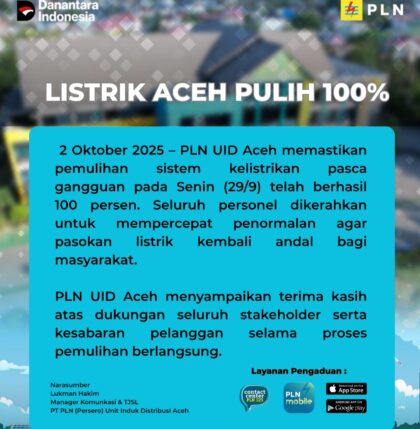 Abdya | • 02/10/2025 • PLN Berhasil Pulihkan Seluruh Sistem Kelistrikan Pascagangguan di Aceh LINEAR.CO.ID | ACEH BARAT DAYA – PT PLN (Persero) berhasil memulihkan kembali 100 persen sistem...