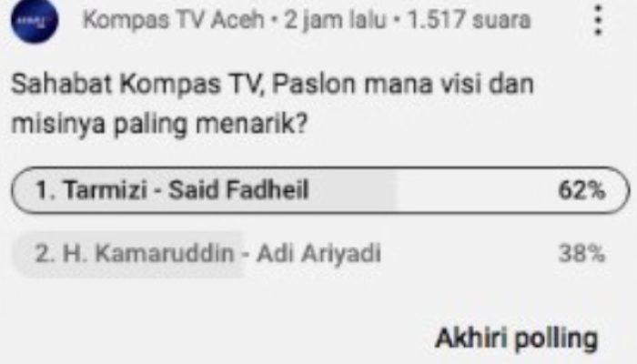 Dari 1.517 suara yang mengikuti polling tersebut menurut pantauan linear.co.id, sebanyak 62 persen memilih Tarmizi,SP-Said Fadheil. Sedangkan dengan H Kamruddin – Adi Ariyadi memperoleh voting sebanayak 38 persen.