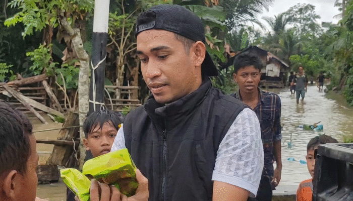 Junaidi tak sekadar menyerahkan bantuan; ia berbincang dengan warga, mendengar cerita mereka tentang rumah yang terendam, usaha yang terhenti, dan kekhawatiran akan kondisi anak-anak mereka.