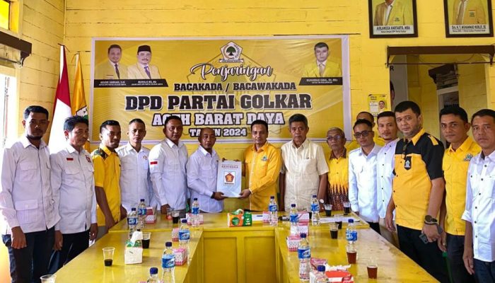 Berkas pendaftaran tersebut diterima langsung Ketua DPD II Partai Golkar Abdya Agusri Samhadi didampingi Korda Golkar Dapil 9 Aceh, H Syamsidik Ibrahim, Ketua Penjaringan Bacalon Bupati Abdya, Muhammad Iqbal, Kuantim Golkar Drs Darmansyah, dan kader Golkar lainnya.