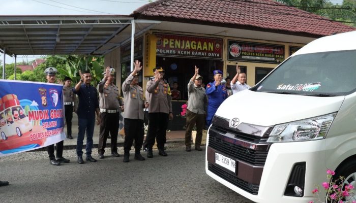 LINEAR.CO.ID | ACEH BARAT DAYA – Kapolres Abdya Agus Sulistianto S.H, SIK yang didampingi Waka Polres, Kompol Misyanto S. E, M.Si dan PJU Polres setempat melakukan pelepasan Mudik gratis yang berlangsung di halaman Mapolres Abdya, Kamis (27/3/2025).