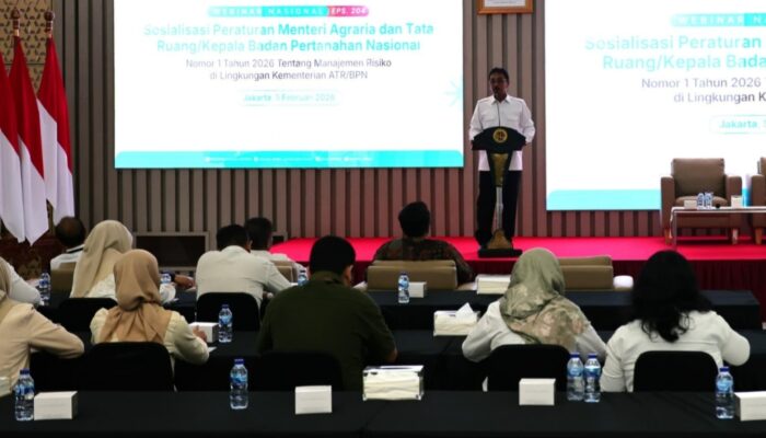Peraturan tersebut menjadi fondasi tata kelola organisasi yang terintegrasi, sistematis, dan berkelanjutan. Untuk meningkatkan pemahaman jajaran terhadap kebijakan tersebut, Kementerian ATR/BPN menggelar Webinar Sosialisasi Permen ATR/Kepala BPN 1/2026 tentang Manajemen Risiko, secara daring dan luring di Aula Prona, Jakarta, Kamis (5/2/2026).