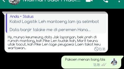 Bahasa tidak etis tang tidak mencerminkan seorang pejabat itu disampaikan oleh Maimun saat mengomentari status WhatsApp ilyas yang menuliskan “Kabid Logistik Leh Mantoeng Lam Ija Selimbot, “Data Banjir Talake Hana di Peremen”. (Kabid Logistik Entah Masih Berselimut dengan Kain, Data Banjir di Minta tidak digubris).
