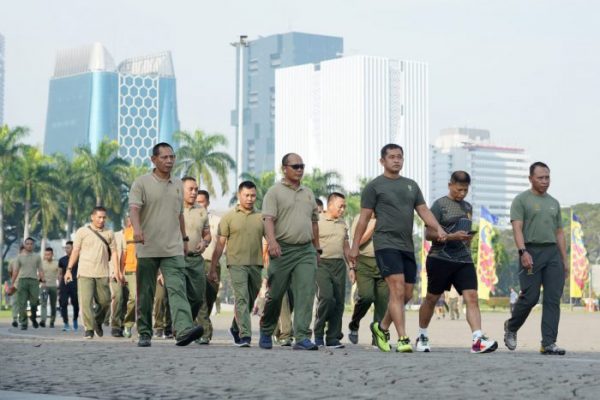 Kegiatan olahraga bersama diawali dengan melakukan gerakan senam pemanasan dilanjutkan jalan santai di lapangan Monas yang dipimpin oleh instruktur yang telah disiapkan oleh personel Jasmani Kostrad dengan penuh semangat dan suasana gembira.