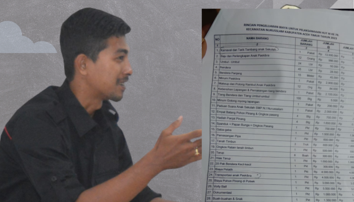 LINEAR.CO.ID | ACEH TIMUR -Salah satu pemuda kecamatan Nurussalam, Far Tueng Bila, mempertanyakan anggaran perayaan HUT RI ke 78 tahun 2023 di kecamatan Nurussalam.