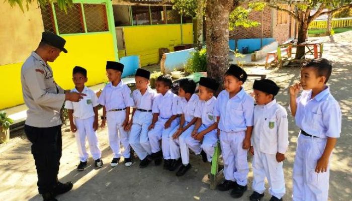 Aceh Timur-Kanit Binmas Polsek Idi Tunong Bripka Yusniadi menyambangi anak usia dini di MIN 16 Buket Teukuh dalam kegiatan Polisi Sahabat Anak. Selasa, (14/11/2023).