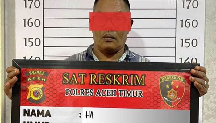 Aceh Timur – Sat Reskrim Polres Aceh Timur Polda Aceh, pada hari Senin, (22/01/2024) mengamankan HA, 50 tahun, warga Desa Paya Seungat, Kecamatan Peureulak Barat, Kabupaten Aceh Timur.
