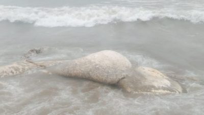 ” Kita temukan tadi pagi sekitar jam 07.00 wib dalam kondisi sudah mati, warga tidak berani mendekat karena ombak lumayan besar, jenis nya juga kurang tau seperti apa, inikan masih hujan jadi kami belum berani melihat secara dekat”.(*)