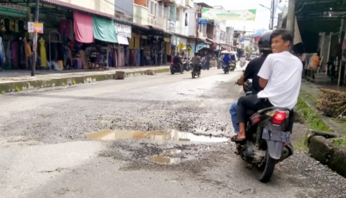 Jalan yang mengalami kerusakan dan berlubang diantaranya ruas jalan pusat perbelanjaan baju di jalan Selamat atau tepatnya depan simpang toko emas Diamond.