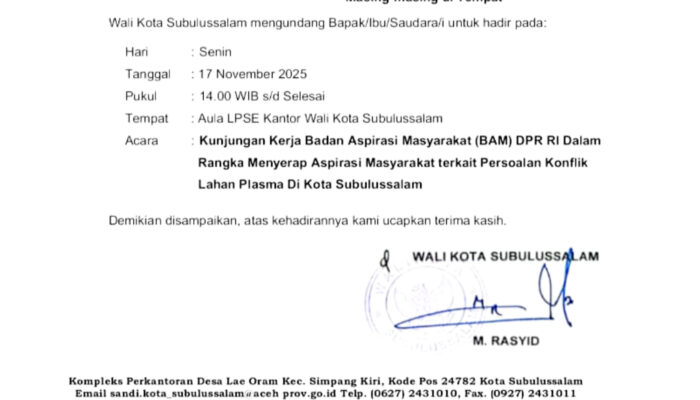 Undangan tersebut, ditandatangani langsung oleh Walikota Subulussalam, yang ditujukan kepada. Wakil Ketua dan Anggota DPRK Subulussalam, Para Asisten Setdako, Kepala Bappeda, Kepala BPKD, Inspektorat Inspektorat.