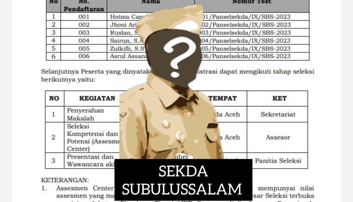 LINEAR.CO.ID | SUBULUSSALAM – Hingga saat ini, 3 (Tiga) besar nama hasil penjaringan Calon Sekretaris Daerah (Sekda) Kota Subulussalam belum juga di publikasikan oleh instansi terkait, ada apa dengan BKPSDM setempat.?